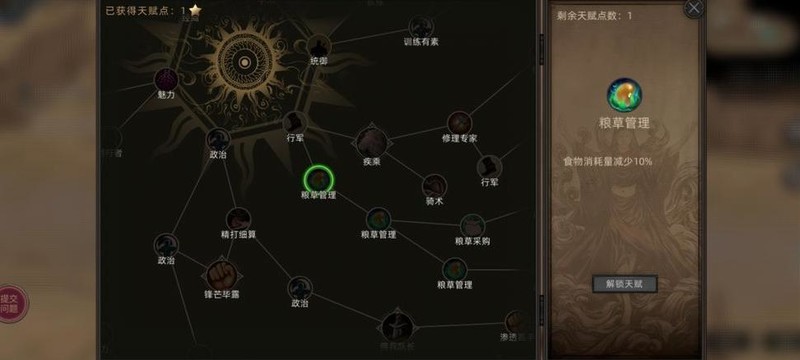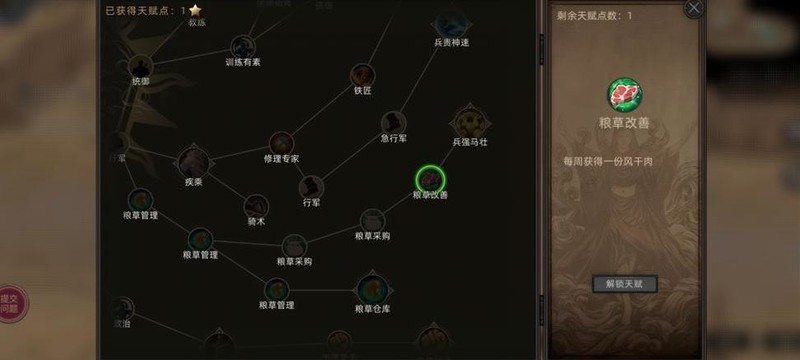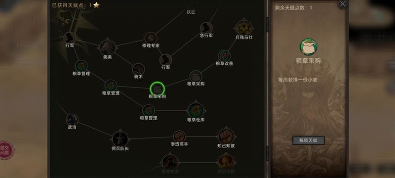 三种天赋可获取食物,偏好此法者可通过传承点领取天赋碎片,开局优先选择粮草管理与采购,资源获取较为稳妥。
