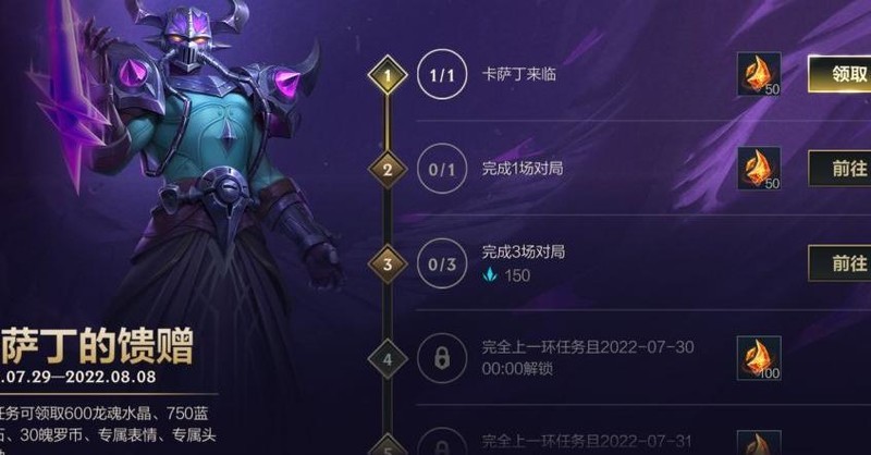 掌握卡萨丁的实战技巧,在召唤师峡谷大放异彩后,别忘了领取来自虚空的丰厚好礼!活动期间完成卡萨丁的馈赠任务,即可获得600龙魂水晶、750蓝色晶石、30魄罗币,以及专属表情和头像等精彩奖励,机会不容错过!