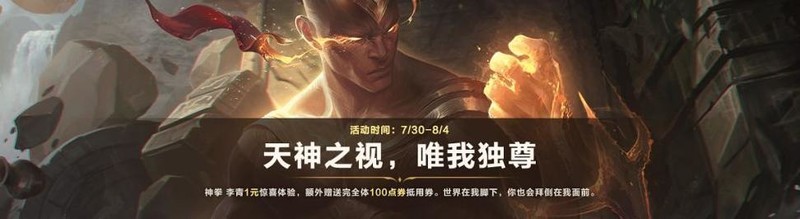 神拳降临,唯我独尊!李青将于8月5日震撼上线。7月30日至8月4日,玩家仅需1元即可限时体验神拳李青,购买还赠送100点券抵用券,助你轻松解锁完全体形态。