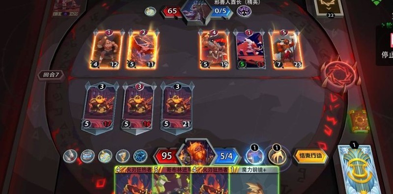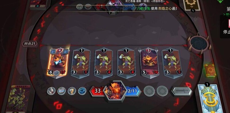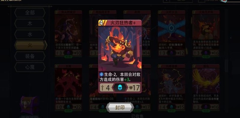 在低轮回阶段,每回合通过火焰伤害清空敌方单位,既能高效输出又能保护自身血量。但从第四轮回开始,梦魇敌人出现后,不仅会大幅削弱火刃狂热者的伤害效果,还会因卡组缺乏场面压制能力,持续威胁我方生命值。此时,不建议为求稳妥加入低费但与体系不符的随从。原因有二:其一,该卡组几乎没有过牌手段,若加入过多非核心卡牌,会导致卡组臃肿,关键组件难以及时抽到,唯有眼魔配合宠物项圈的组合值得保留,其余低费生物应尽量避免;其二,作为火系构筑,法力资源极为紧张,前期必须优先确保装备类卡牌顺利上手并装备,根本没有余裕去召唤挡伤用的随从。正因如此,锻血为甲这一思路的核心在于:在高轮回阶段主动以生命值为代价,承受梦魇的一轮攻击,以此换取节奏和输出空间。这也意味着后期常处于血线危急的状态,极其考验玩家对时机与操作的把握。此外,许多在半血以下触发效果的道具,在此卡组中能发挥超常作用,成为逆转局势的关键助力。
