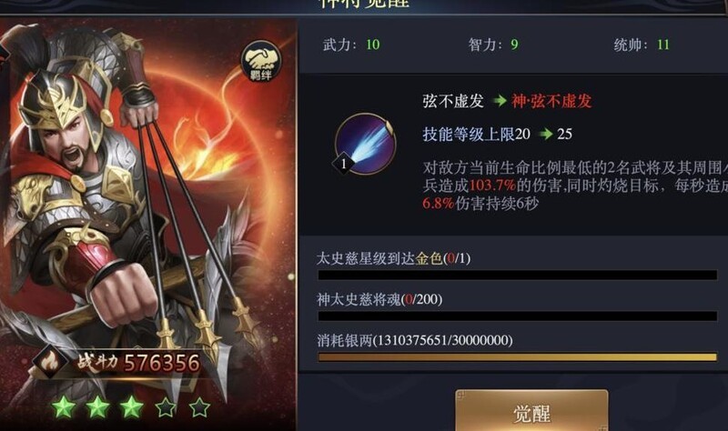 太史慈升至金星,神将魂达200,消耗三千万银两即可完成。