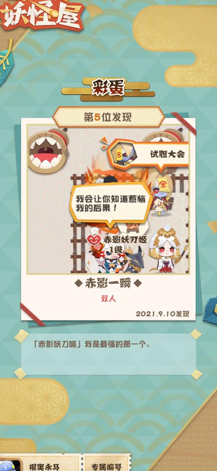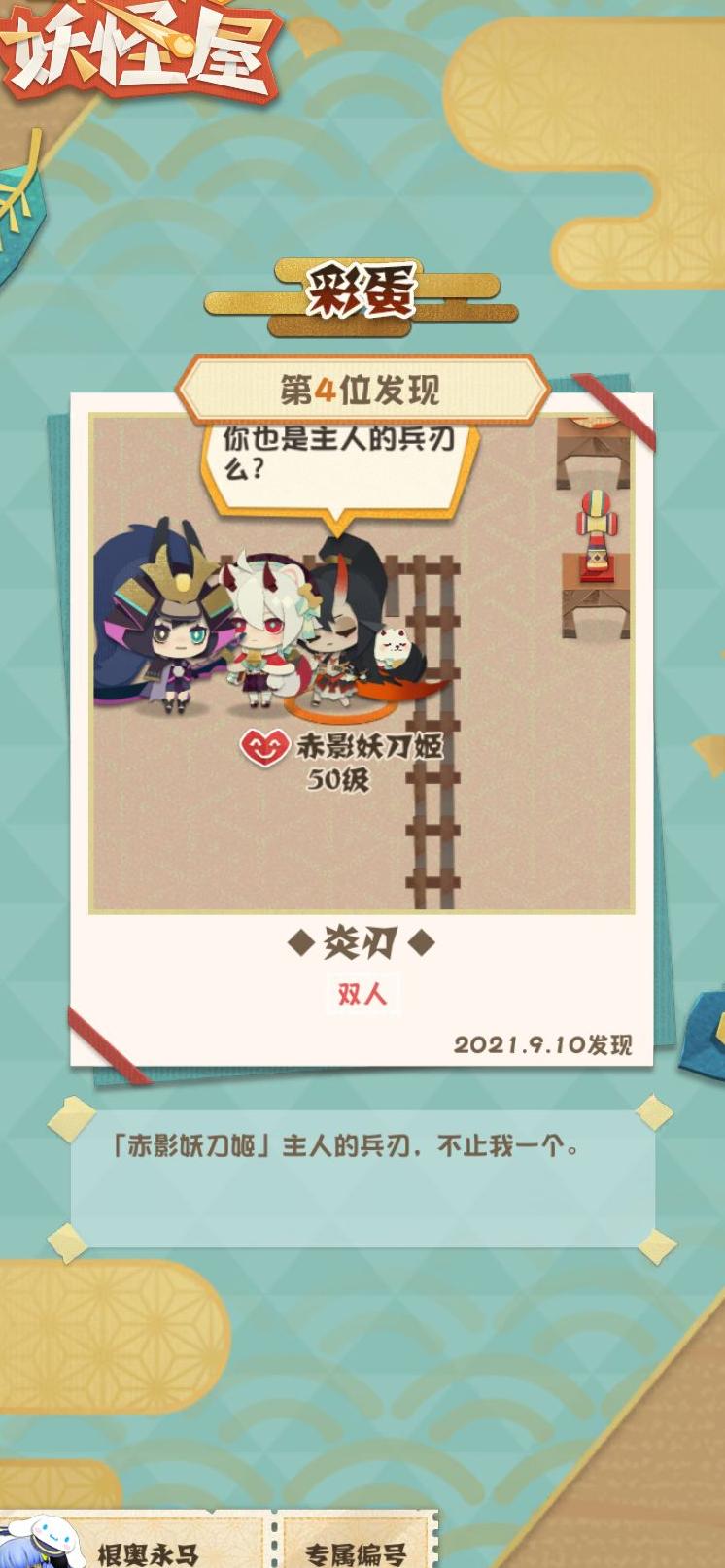 彩蛋5:「炎刃」赤影妖刀姬双人互动,将赤刀置于鬼切身旁,待其说出你也是主人的兵刃么?后点击赤刀即可触发。若无鬼切,可尝试替换为其他持有兵器特征的式神,同样可能激活该隐藏剧情,建议家主多加探索不同组合。