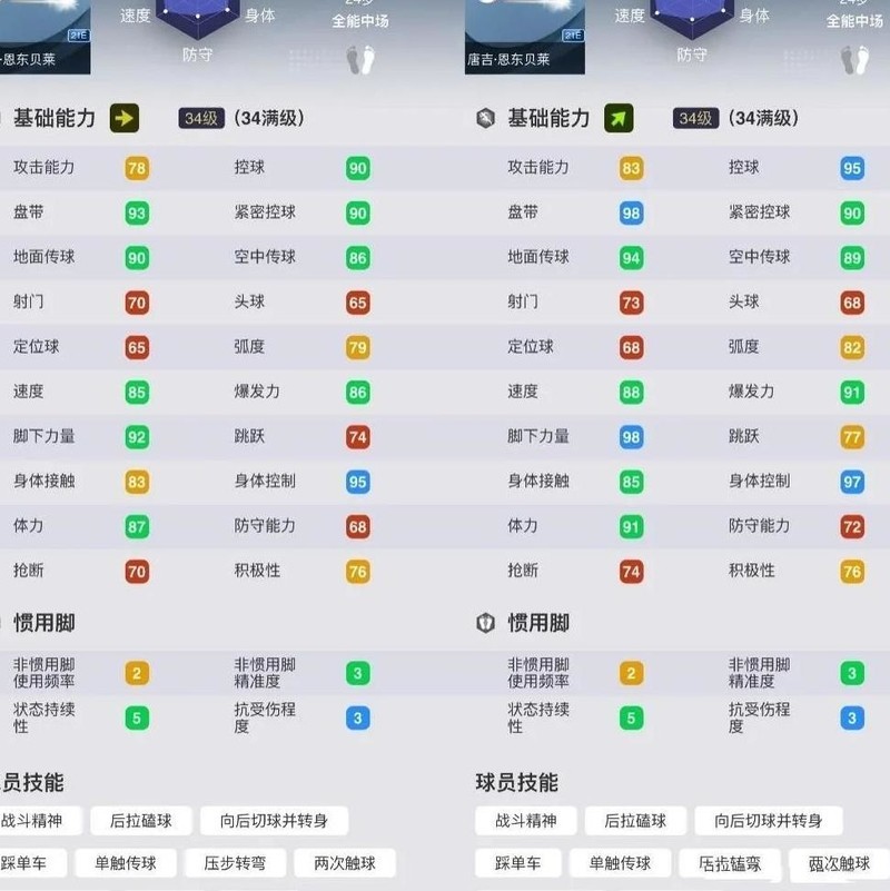身高181厘米,体重76公斤,对抗能力较弱,斜向上身体接触评分仅为85,比赛中应尽量避免频繁身体对抗。此外,体力续航表现不佳,即便在斜上位置体力值也仅有91,持续作战能力有限,建议务必准备替补球员随时轮换,以保持场上竞争力。