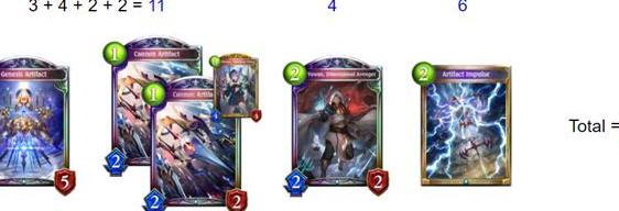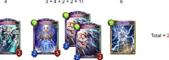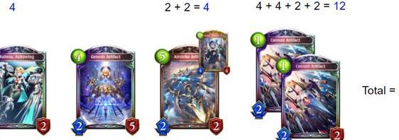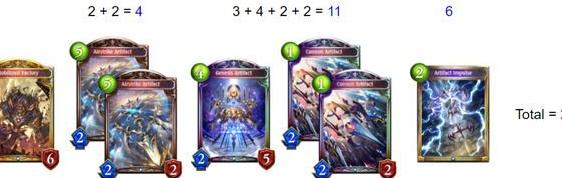 先召唤两个0费典范造成4点伤害,返还2点费用;接着打出创世造物并回收1费,再部署两个加农造物。进化创世造物前需先处理至少一个典范避免卡场,消耗后返还2费。清理对方场面后,使用两个加农造物共打出11点伤害,并各返还1费,最后以创造物冲击造成6点伤害,总计可达成21点输出。