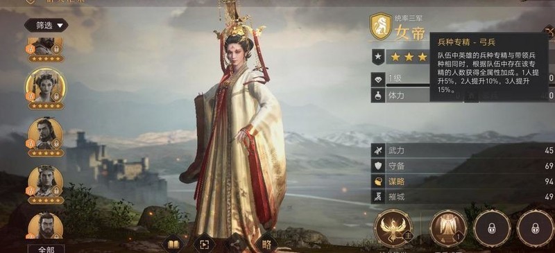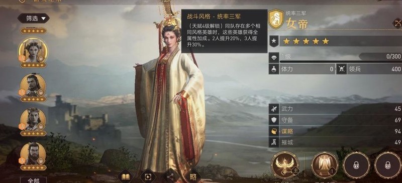 当队伍中三位上阵武将的战斗风格相同,且英雄天赋达到四级时,可激活额外属性加成。因此建议优先培养同一战斗风格的三名武将,以最大化战力。目前游戏中存在多种主流搭配体系,如连击骑、反击枪、智谋剑、状态弓、主将弓(女帝弓)等,玩法丰富多样。具体英雄的技能效果及推荐搭配可在游戏内点击英雄下方的略字查看,官方提供了详尽的说明与搭配建议,便于玩家深入了解并选择适合自己的阵容组合。