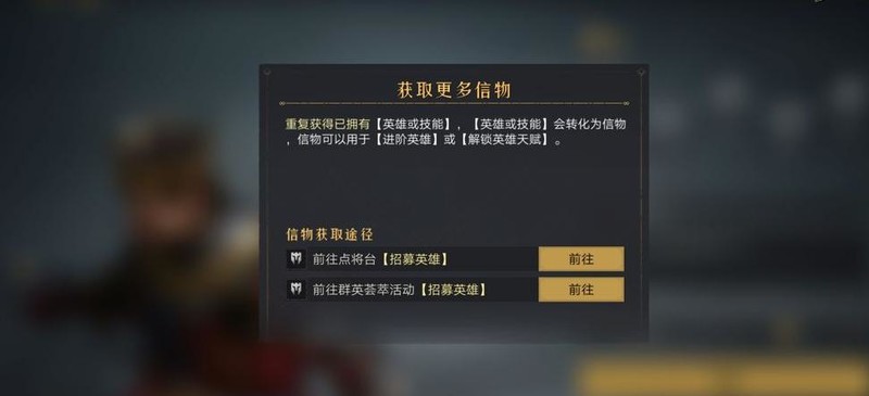 信物获取方式所示,通过重复抽取英雄或技能即可获得,抽奖及各类活动均可获取。