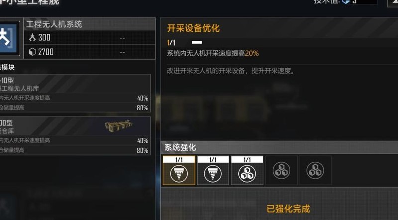 工程舰可通过升级提升开采效率与仓库容量。根据攻略建议,先强化一次采集速度,接着连续强化两次仓储,最后再次提升开采速度,如此搭配可使整体采集效率达到较优水平。