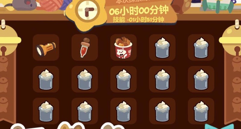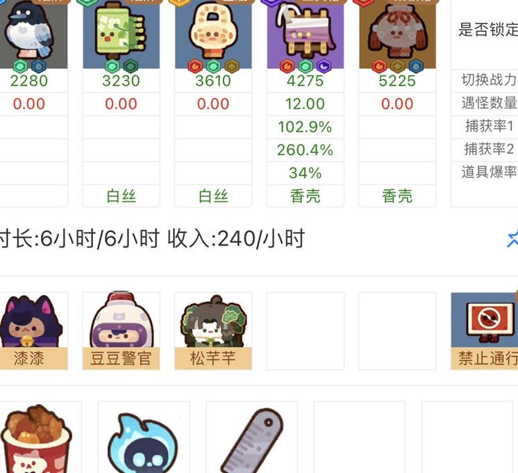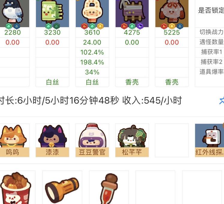 这次没有猎人加成50%,需搭配两个提升捕捉率的玩具,第三个位置若无新池四妹(属性减30%)可用神仙司机替换红外线,也可灵活换成其他减时工具,确保效率。