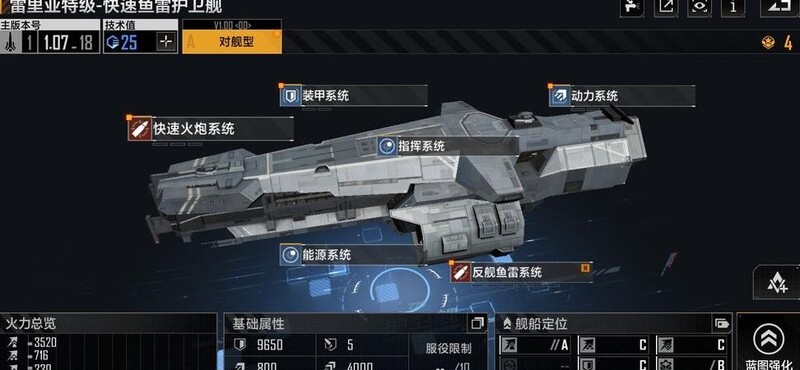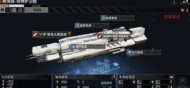 接下来介绍静海级的武器配置。其主武器为火炮,副武器为导弹。火炮攻击频率高,单次伤害较低;导弹则发射间隔较长,但爆发伤害较高,主要用于对抗中型舰艇。虽然对中型舰的单发伤害不算突出,但也具备一定打击小型舰的能力,包括护卫艇和飞机等目标,整体火力配置兼顾持续输出与局部爆发。