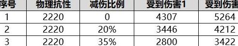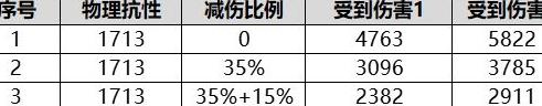 由表格可知,伤害减免作用于物理抗性减免之后,按对应百分比减少所受物理伤害。