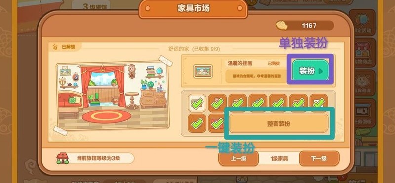 返回界面点击左侧黄色箭头,进入家具市场,选择整套购买并集齐家具后即可升级旅馆,还可随时更换旅馆内部布置。