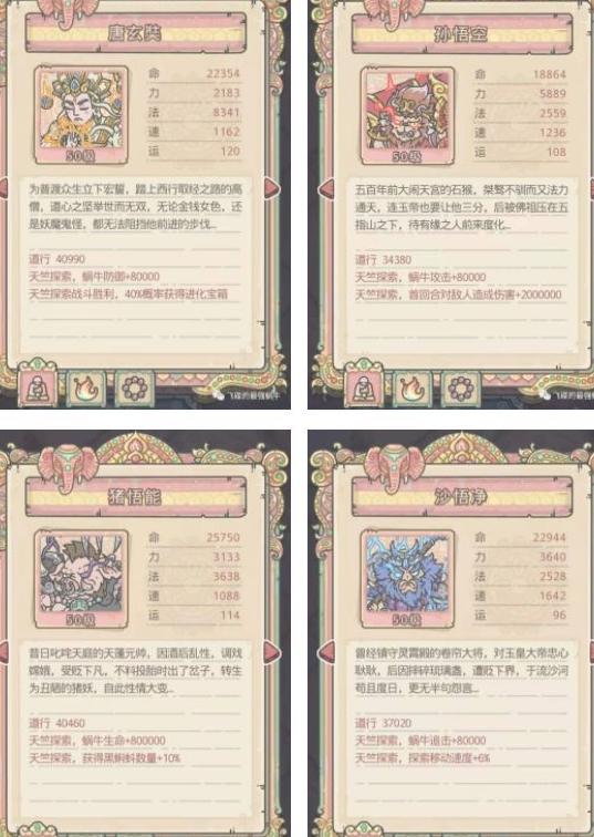 四位师徒是西行游记中的核心角色,在蜗牛探索中可提供显著的四维属性加成及特殊增益。这些加成会随着师徒等级、技能和装备的提升而增强。初始等级上限为20级,通过情报升级后最高可达50级,进一步释放强大潜力。