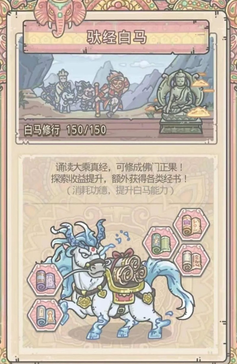 探索结算可获取五种经书,消耗功德提升白马能力,最高可达三十级。