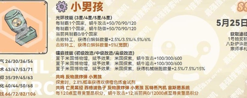 本次活动最终奖励为小男孩,其属性、技能及共鸣效果详见配图。