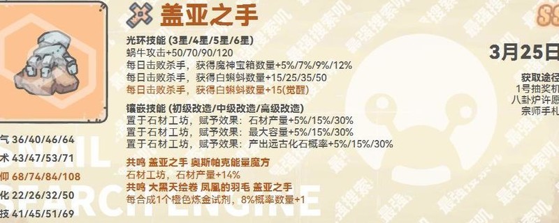 优先选择图示中的伊索寓言,尽管效果平平,但获取难度较高。盖亚之手虽为石材工坊毕业贵重,但可在重构商店兑换,因此不推荐专门换取。