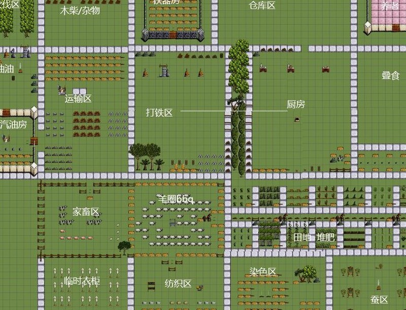 田地设在厨房下方,便于烹饪时随时采摘食材。番茄和甘蔗这类常用于叠食的作物,应尽量靠近叠食区种植,使用起来更顺手(图中位置有误,应调整至叠食区下方才合理)。而厚岸草、辣椒、洋葱等用量较少的作物,可种在离厨房较远的位置,或靠近羊圈一侧(图示再次出错),因需求不多,无需大面积种植,除非有对称布局的强迫倾向。小麦消耗量较大,适合成片种植;为保持布局协调,可与之对称地种植苎麻,因其使用频率也较高(图中种植方位仅供参考,实际已有混乱)。若对苎麻需求极大,则不会局限于小块田地,而会选择开阔地带集中种植,以满足日常所需。
