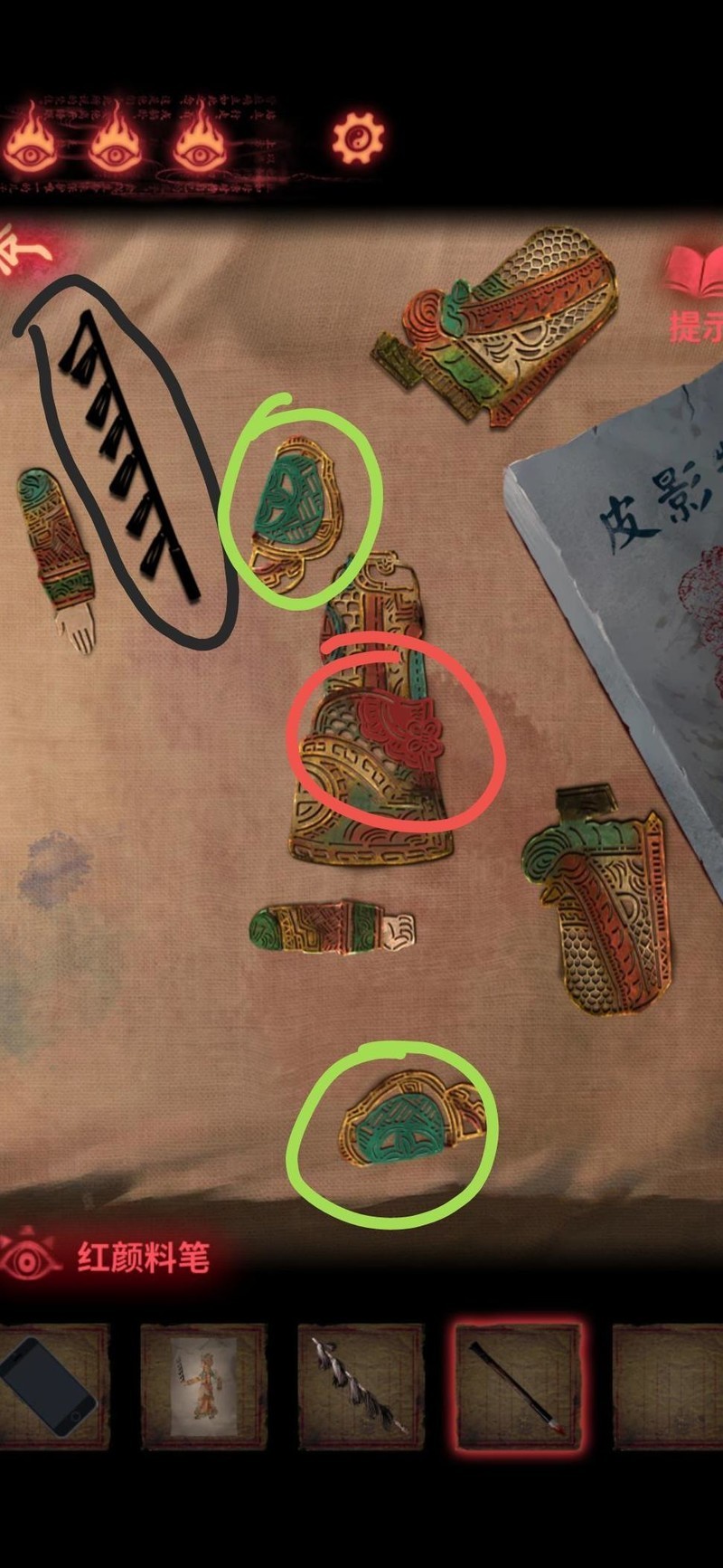 用红笔在符纸上写封字,蘸取红色颜料。返回场景二,点击木偶,在其头部书写封字,取得马鞭,并将油伞交予木偶手中。