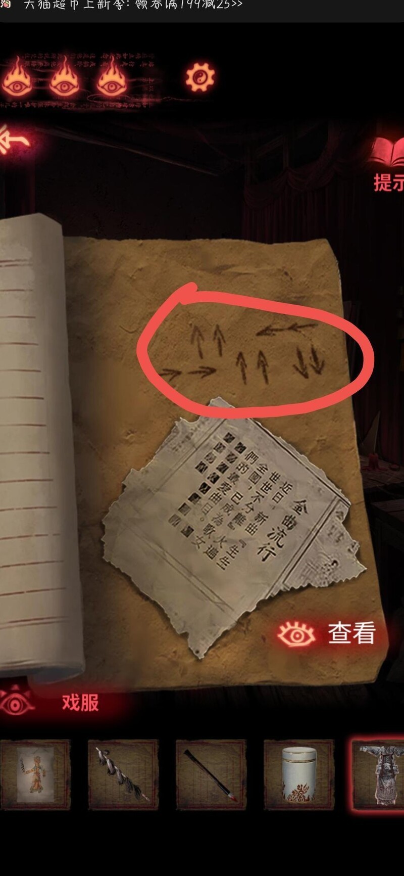 进入第三场景后,先点击桌子取得空瓶,再点击戏服获取戏服。接着查看地面的箱子,从中拿到皮影的头部。桌子上的笔记本最后一页顶部有箭头提示,操作顺序为:上、左、右、上、下。