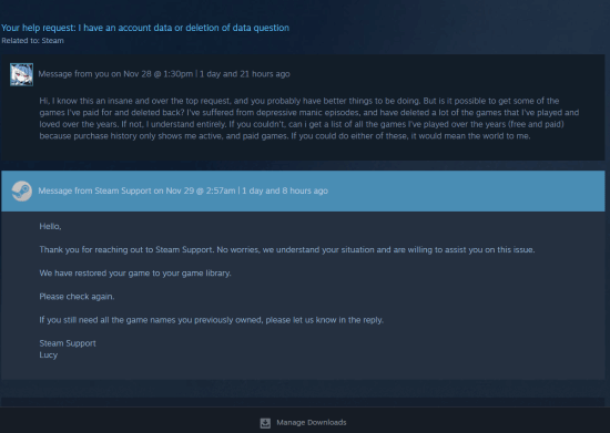 据聊天记录显示,该用户因个人健康原因,在情绪不稳定的情况下删除了大量已购买并长期珍藏的游戏内容。意识到行为冲动后,他联系客服寻求帮助,希望能够恢复这些游戏,或至少获取一份完整的购买与游玩记录作为留存。