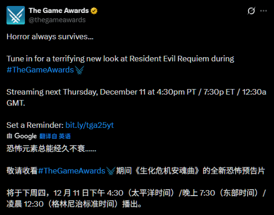 12月5日消息,今日凌晨,卡普空旗下备受关注的恐怖游戏生化危机9:安魂曲宣布将在即将举行的TGA活动期间发布全新预告片,具体时间为12月12日上午8点30分。该消息一经公布,迅速引发玩家群体的热烈讨论。