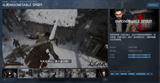 由哈尔滨智云科技开发有限公司推出的抗日题材动作游戏斗虎现已登陆Steam平台,商店信息显示,该游戏预计于2028年9月18日正式发行。