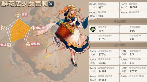鲜花店少女巴莉(土花)以超高单体伤害和远程穿透攻击称霸PVE,曾缔造韩服前百100%使用率神话。虽后期面对特定BOSS与共斗环境略显乏力,但凭借稳定输出与角斗场强势表现,仍是T0级核心之一,综合推荐度高达4.5星。