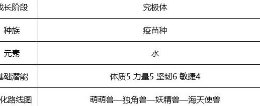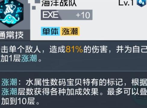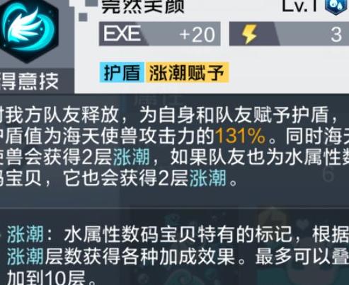 可为自身及队友施加护盾,增强队伍整体防御能力,尤其能对血量较低的数码兽进行定向保护。其得意技可在自身及水属性队友身上叠加两层涨潮效果,配合海天使兽更高效地累积涨潮,稳定触发被动技能,实现完全抵抗状态的免疫效果。若与水属性数码兽协同作战,还能加速涨潮层数积累,更快发挥增益作用,提升团队持续作战能力。