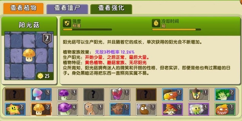 阳光菇曾是最强阳光植物,如今沦为凑数角色。升至四阶集齐五阶碎片后,方可进行转基因升级。