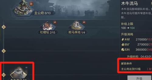 满级后可建造木牛流马,提升补给量,助力持久作战。