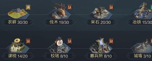 三级可建造课税建筑以增加铜币产出,校场用于扩充预备役,募兵所提升征兵效率,城墙则强化城防体系。