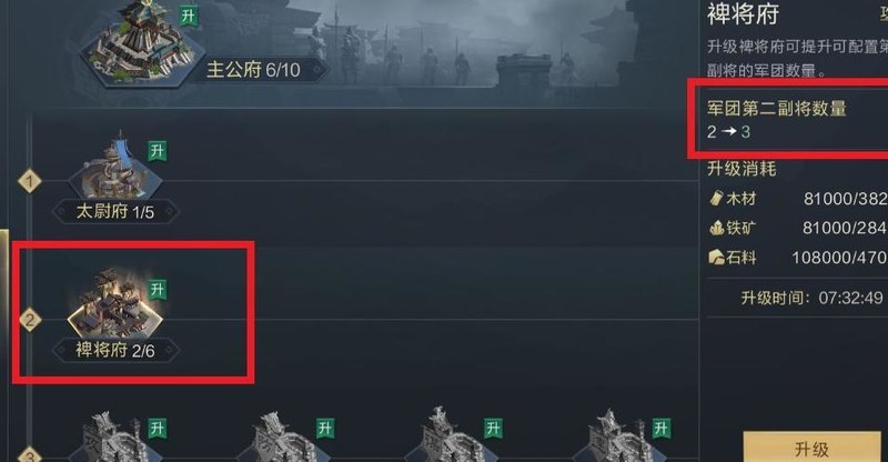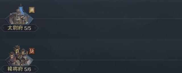 提升国库至5级,主公府至6级(需21将令值),太尉府与裨将府均不低于2级。