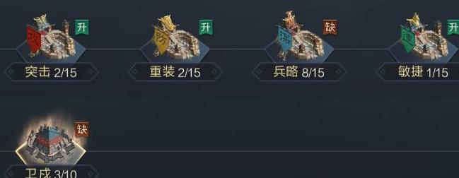 7级可建练军所解锁练将,以及拒马工营用于强化防御。
