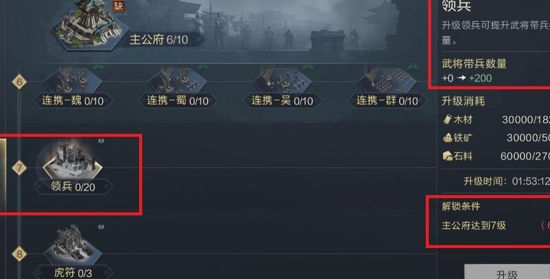 主公府升至七级后,将开启领兵与联军所两大关键建筑。