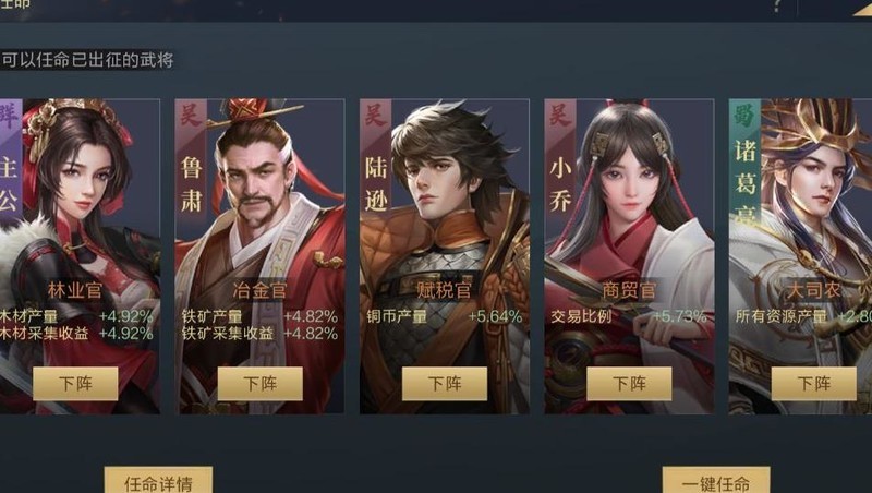 升级农耕、伐木、采石、冶铁和课税等资源建筑至10级,并完成相应任命,以大幅提升资源产出效率。