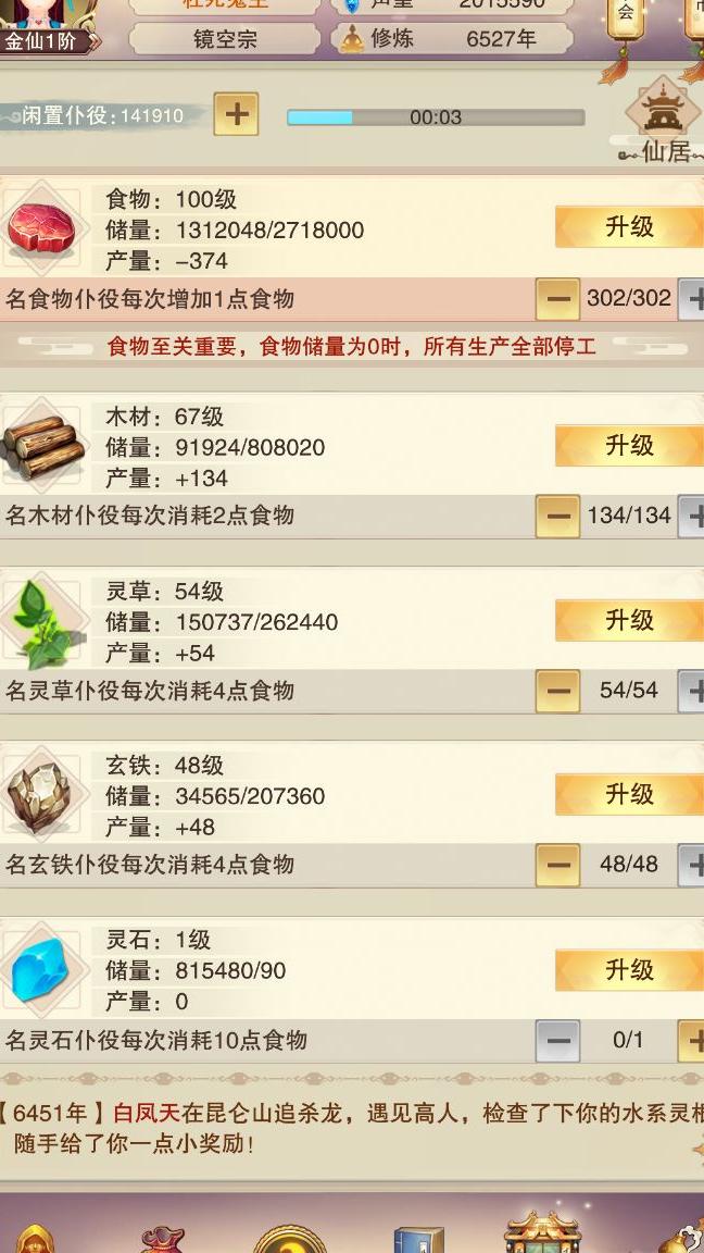 各位同道,小白回归了。今日成功突破至金仙一阶,领取了富贵道童,已可炼制养神丹。洞府现已升至100级肉属性,正着手提升聚灵阵。当前各项进度为:肉100、木67、聚灵阵173、洗髓池120。原可先将洗髓池升至130,但考虑到现阶段130级水道童带来的收益有限,而聚灵阵达到228后对修为提升作用显著,故优先选择强化聚灵阵,以最大化修炼效率,为后续突破打下坚实基础。
