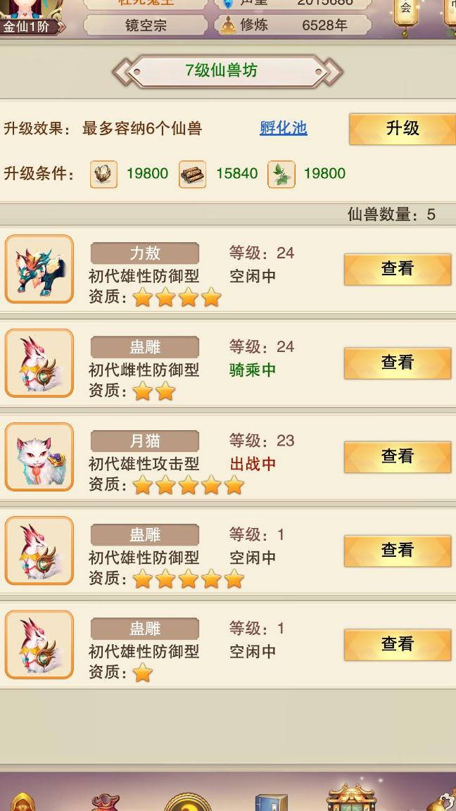 目前主力灵兽有三只:跑车、飞机和战斗猫,等级都在24级左右,暂时用来过渡。等聚灵达到200级就能孵化凤凰蛋了,现在已经存了14个凤蛋,准备届时集中孵化提升战力。