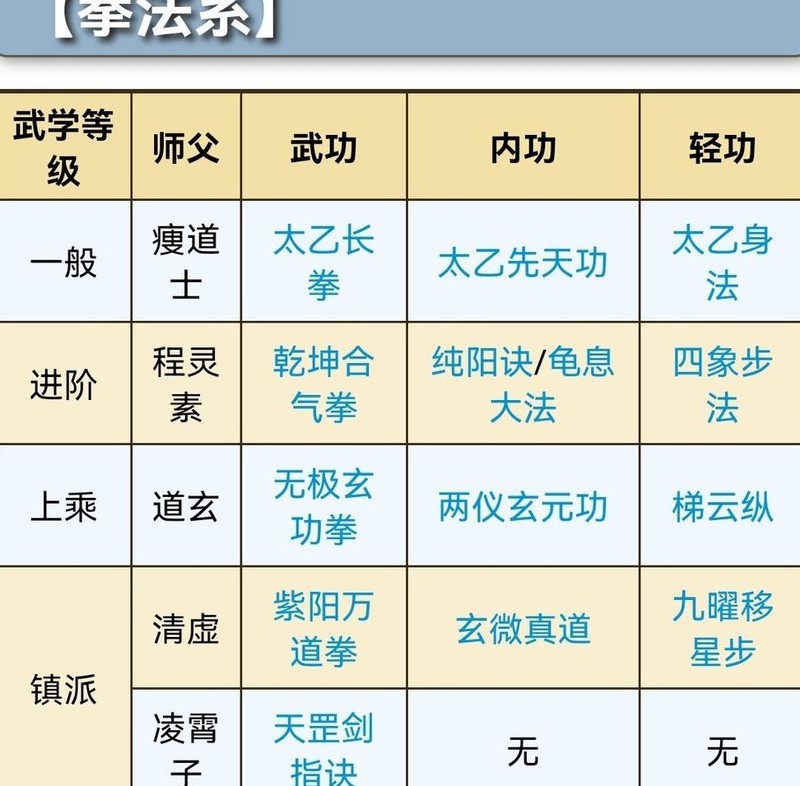 接下来为大家讲解太乙门派的核心功法。该门派秘籍种类丰富,整体较为均衡,这里重点介绍几项关键技能,其余略作提及,若有深入需求可留言或进群交流。追风掌劲提供10点拳脚加成与5点穿甲,实战效果不及金刚拳劲。太极拳意满级后赋予12点拳脚、10点招架与5点破闪,但与其他拳劲类功法互斥。道藏需300道学修为方可修至满级,提供10内息与10破闪,三回合后激活减伤并提升5点攻击力(叛出师门后失效)。鲲鹏真意满级可获得10速度、10韧性及15真元,是提升续航与先手的重要选择。
