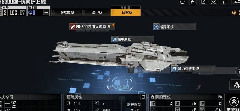 侦察型FG顾名思义以侦测任务为主,经过18点技术强化(含两次常规速度与一次曲率速度提升)后,其常规航速可达1430,曲率航速高达6325,具备极强的机动与探测能力。