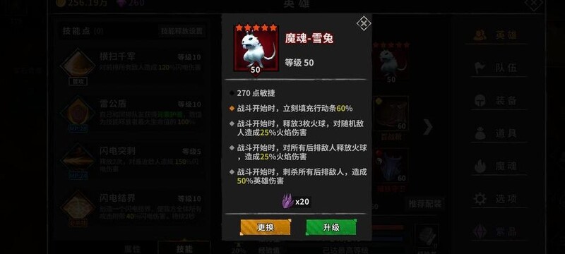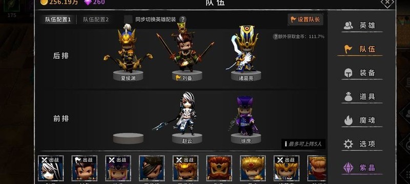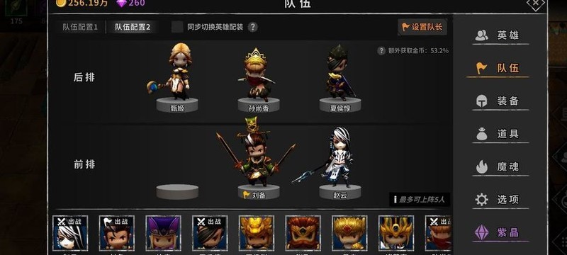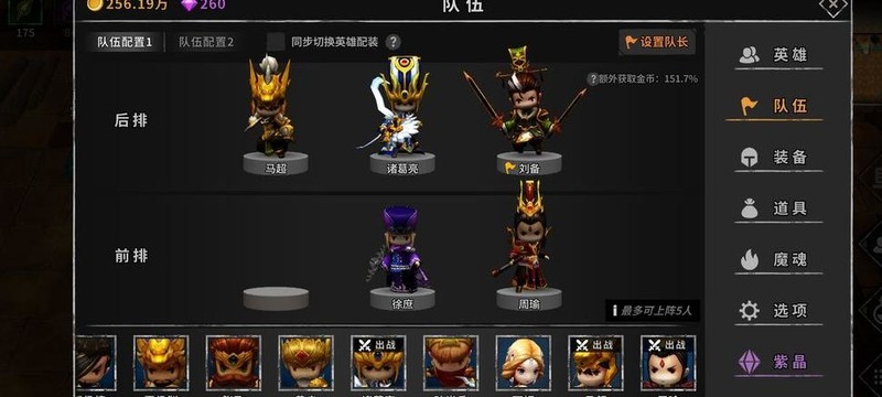 技能配置前文已详述,魔魂角色对应为:龙母即诸葛亮,角斗士为刘备,兔子是马超,巫魂指周瑜,狼对应徐庶。第二支队伍仍由夏侯领衔,保持不变。