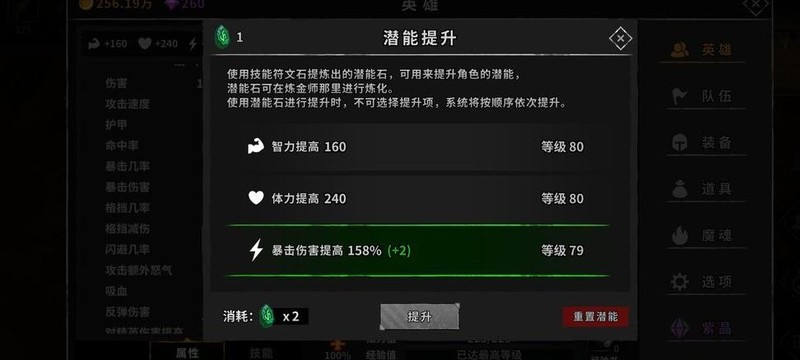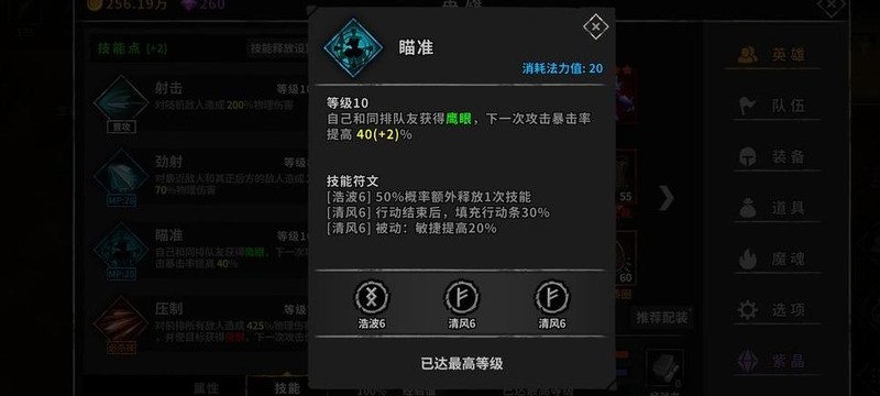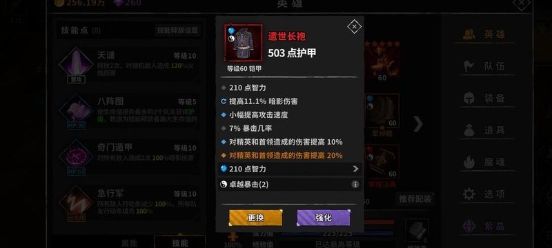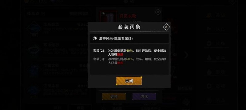 此时已进入后期细节优化阶段。诸葛亮的攻速需求不再需要达到1.2,由于马超的大招可瞬间提升40点行动条,配合遗世提供的攻速加成,即使攻速为1.1,诸葛亮也能确保先手出手。不过马超大招仅提供30%暴击率加成,因此诸葛亮必须搭配五星龙母,并将自身面板暴击率堆至50%,才能实现战斗中每次攻击必暴击。第一队的诸葛亮在拥有专属两件套的基础上,还可再凑齐三件卓越暴击套。第二队夏侯惇除专属两件外,建议再搭配三件进阶体力套,尽量保持原有装备不变。套装成型后,头部附魔改为疯狂,衣服选择火焰增伤21%,鞋子选择精英伤害20%,盾牌使用充盈属性,武器仍保留普攻+1效果。此外,可以入手孙尚香作为补充角色,其装备应优先选择减少蓝耗和增加闪避的类型。附图是本人所用的孙尚香,培养程度一般,仅作参考使用。