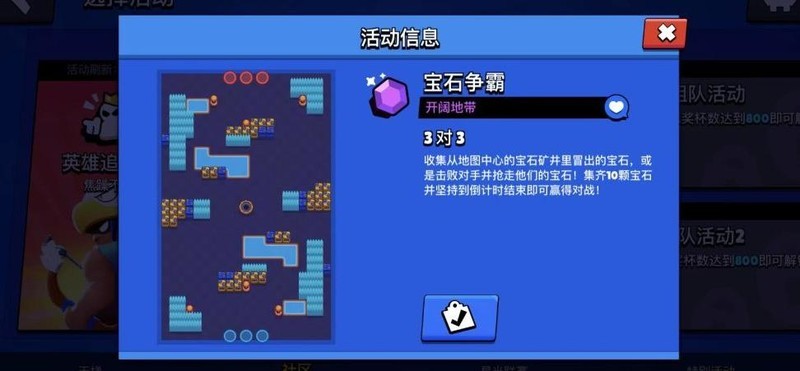 新手玩家接下来将参与第二个活动——宝石争霸。该模式为3V3团队对战,设有时间限制。每队三人协作争夺地图上的宝石,率先收集到10颗或以上宝石的队伍获胜。比赛在规定时间内进行,时间结束前达成目标或积分更高的一方赢得胜利。