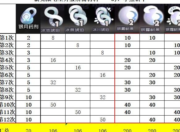 从图表可看出:新橘九inf需药剂70个,旧无限材料各需106个,新型无限材料每种需200个。
