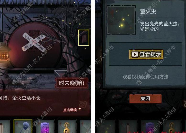 点击树上相思牌,用渔网捕捉飞舞的萤火虫。