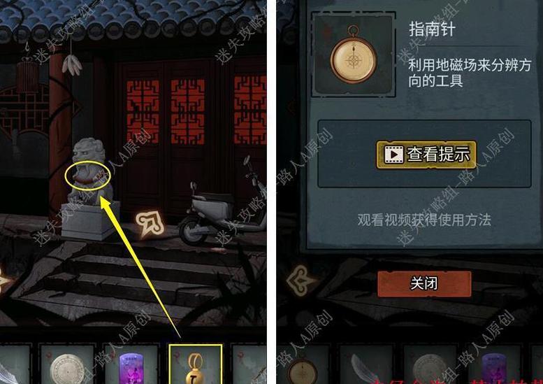 把铃铛系在石狮子的红绳上,便可获得指南针。