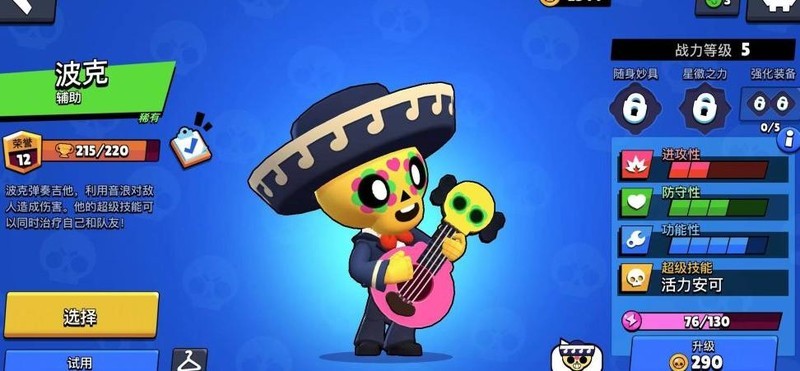 稀有度为稀有,生命值介于3800至5320之间,属于中等水平。普通攻击伤害范围在660到924之间,超级技能伤害可达2100至2940,具备较强的输出能力。装弹速度为1.6秒,处于中等水准,移动速度为720,灵活性适中。波克的武器是一把吉他,攻击时会释放出强烈的音浪,对范围内的敌人造成持续打击。其普通攻击名为强袭之音,演奏时产生的声波覆盖面积广,属于群体伤害类型,在开阔地形中几乎无法躲避,能有效压制对手。最独特的是他的超级技能,不仅能为自己恢复生命值,还能同时治疗附近的队友,兼具输出与辅助功能,使其在团队作战中扮演重要角色,既能前线参战,也能在后方提供支援,适应多种战斗场景。
