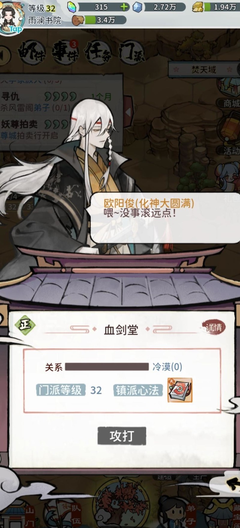 可攻打的门派仅限于主动攻击,击败掌门后可在其背后的箱子中获得丹方。此类行为不会影响正邪值,即使将门派仇恨打满,对方也只会怒骂而不会反击。真正影响正邪的是对地图上随机人物的攻击行为。