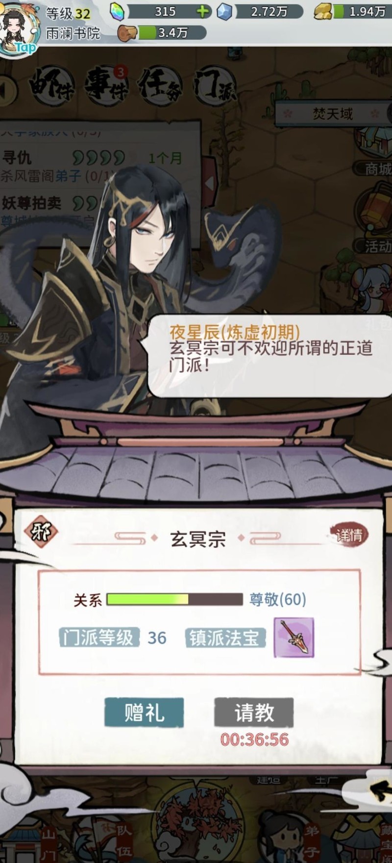 祖师殿是门派最大建筑,玩家可在此查看与各门派、个人及城镇的关系状态。