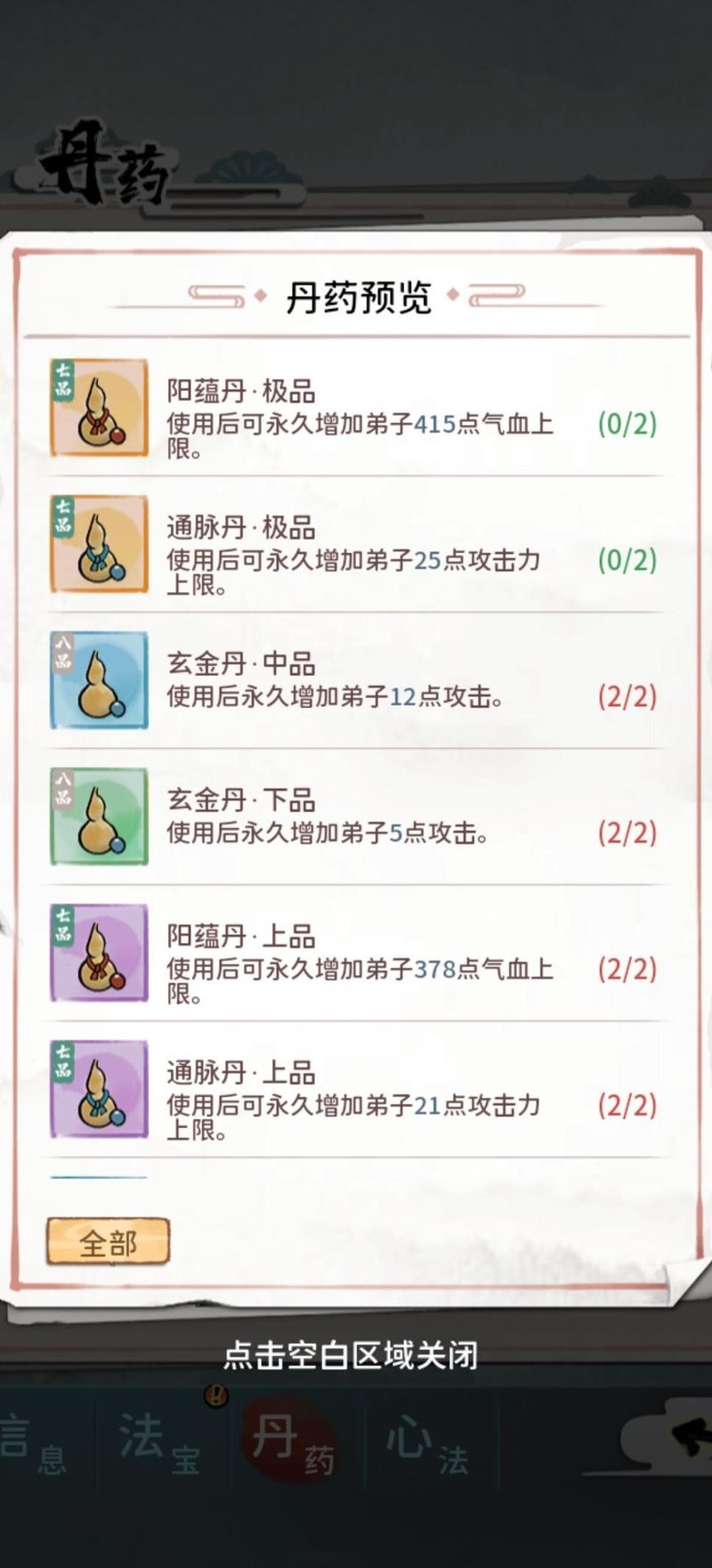 在丹药预览界面可查看弟子服用过的元婴期前属性丹,但金色通脉丹与金色阳蕴丹实际无法获取,属显示异常。