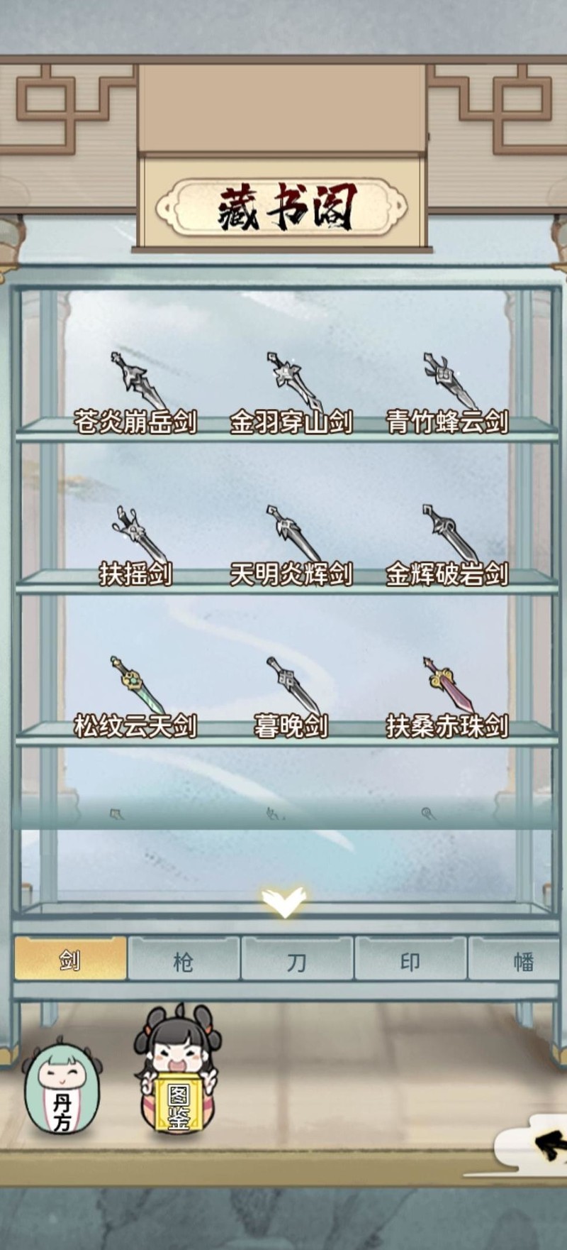 藏书阁可查看已拥有的丹方及全部武器类法宝图鉴。