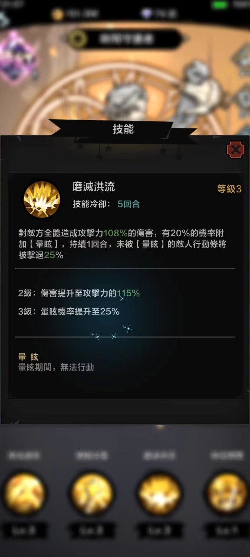 光老头三技能原本有25%晕眩概率,在我方特命200、敌方特抗100的情况下,实际效果翻倍,相当于50%的晕眩触发几率。
